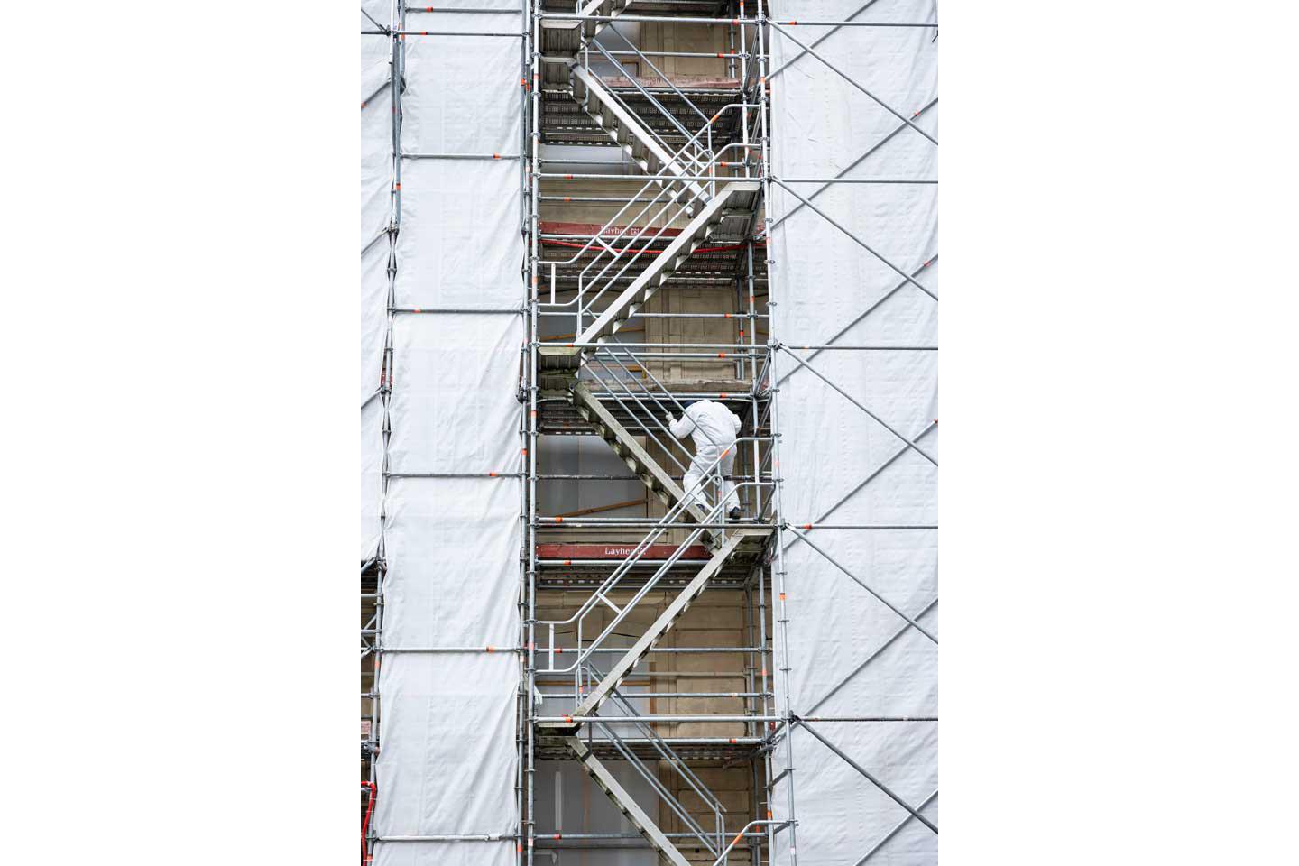 Quant aux autres, ceux qui découpent, donnent forme et soudent les plaques pour la couverture par exemple, ou ceux qui purgent les joints entre les pierres de façade, ils passent obligatoirement par un escalier qui leur est dédié lorsqu’ils quittent leur poste. Celui-ci aboutit à une zone confinée équipée d’unités mobiles de décontamination dans lesquelles les travailleurs retirent leurs EPI et vêtements pollués, puis se douchent avant d’enfiler des habits propres. La nouvelle organisation a porté ses fruits puisque, depuis le redémarrage du chantier en septembre dernier, les prélèvements réguliers menés par les entreprises comme par la maîtrise d’ouvrage donnent sur l’échafaudage des résultats significativement plus bas qu'auparavant et stables. En cas de remontée, les causes de l’augmentation devront immédiatement être recherchées.