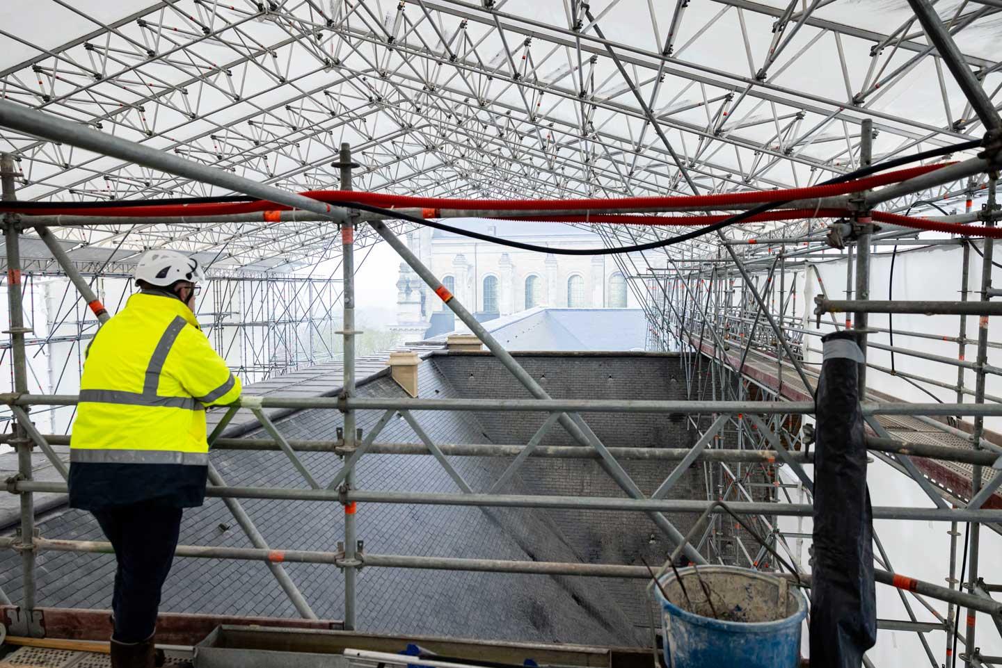 Pour partir sur de bonnes bases, il a été demandé aux entreprises de lister les différentes techniques d’intervention et de retenir les processus de travail et les mesures techniques permettant d’obtenir une émission de polluant aussi basse que possible. En parallèle, outre la multiplication des pédiluves permettant de capter les particules de plomb sur les chaussures à chaque accès et à chaque étage de l’impressionnant échafaudage qui enserre le bâtiment, des lave-mains ont été positionnés à divers endroits du chantier. Tous ces équipements sont reliés à des systèmes de filtration des eaux.