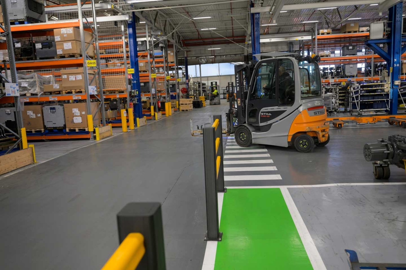 Conçus en interne pour s’adapter parfaitement au large éventail de pièces, ces chariots facilitent la récupération des pièces par les opérateurs grâce, par exemple, à un système de distribution gravitaire ou une ergonomie bien pensée. Certains de ces chariots sont munis de système d’accrochage sur la ligne de montage afin de suivre l’avancement des engins en cours de fabrication et de permettre aux équipes d’avoir tout le nécessaire à portée de main. « Pour apporter ce mobilier jusqu’aux postes de travail, d’une part un petit train effectue des allers-retours depuis les stocks et, d’autre part différents types d’AGV sillonnent les allées, indique François Evano, coordinateur projet produit qui a orchestré la modernisation de l’usine. Ajoutez à ces flux ceux des engins et des piétons, vous comprendrez que la prévention des collisions est une autre de nos priorités. Nous avons porté une attention particulière à l’élaboration de notre plan de circulation. » Partout, les marquages au sol identifient clairement les voies utilisées par les uns et les autres.