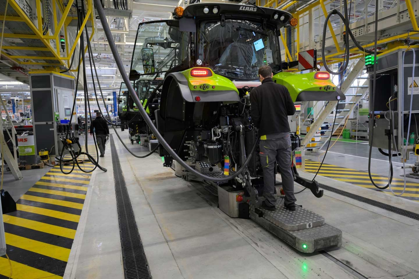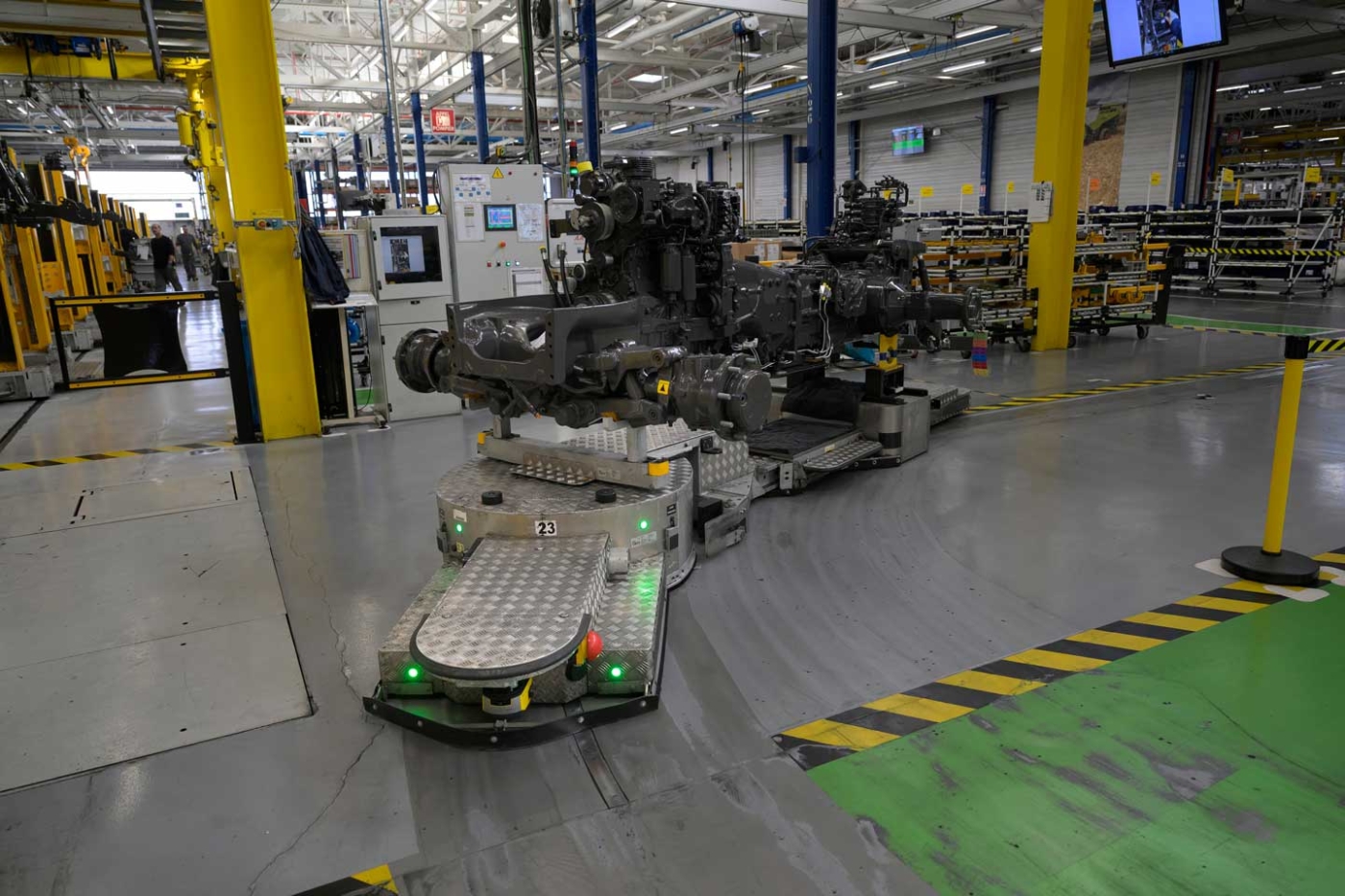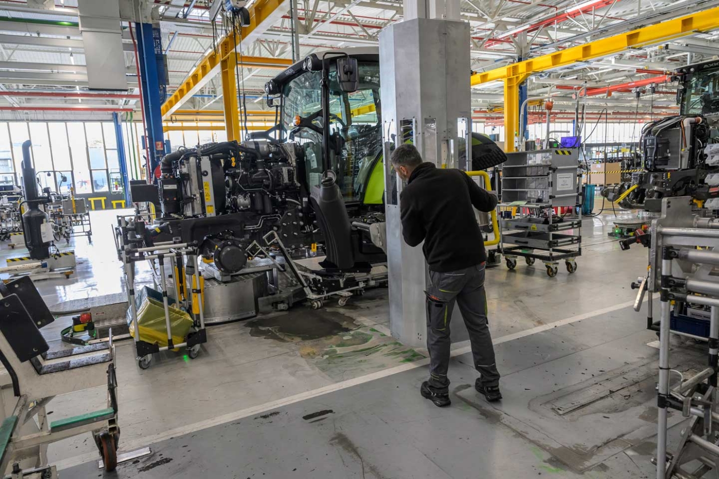 Dans les 70 000 m2 de l’atelier, serpente la ligne de montage. Celleci n’est pas constituée de convoyeurs mais d’une flotte de véhicules à guidage automatique (AGV), cheminant en file indienne le long de câbles enterrés. Au fur et à mesure de leur progression, les tracteurs prennent forme par ajout d’éléments sur la poutre, véritable colonne vertébrale de ces mécaniques. Les engins participant à ce défilé ne sont pas tous identiques car la production n’est pas organisée en série, mais bien en fonction des commandes clients, qui ont le choix entre différents modèles de tracteurs, mais également entre une multitude d’options.