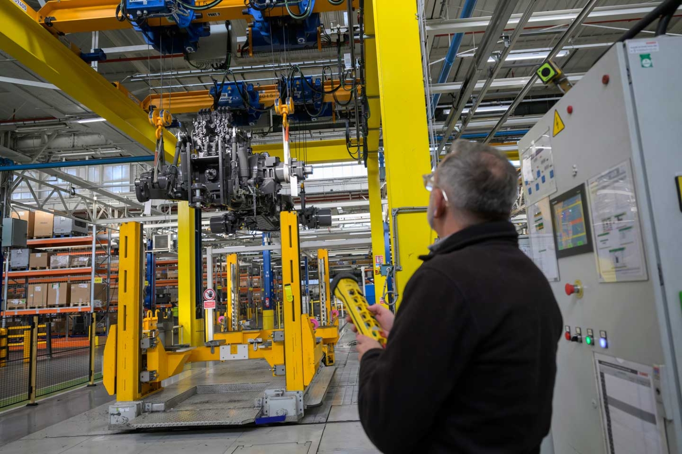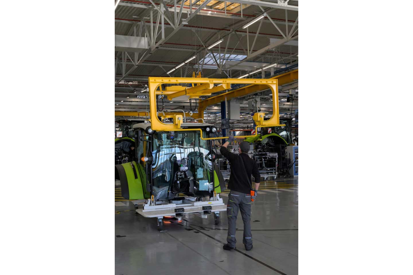 Pour être en capacité d’effectuer les opérations de levage en sécurité, Claas Tractor a fait le choix de concevoir en interne les accessoires qui se positionnent entre le crochet de l’équipement et l’objet à déplacer. Parfaitement adaptés, ils évitent les risques de balancement et de chute de la charge. À la sortie de l’atelier peinture, le poste de transfert du châssis bénéficie de dispositifs de sécurité supplémentaires. Deux ponts roulants synchronisés sont programmés pour positionner les élingues à l’aplomb des points d’accroche dont l’emplacement varie en fonction du modèle de tracteur. Lorsque l’opérateur appuie sur le bouton, la tension des élingues est vérifiée. Si l’une d’entre elles n’est pas accrochée, le levage ne se fait pas, supprimant le risque de chute de la pièce.