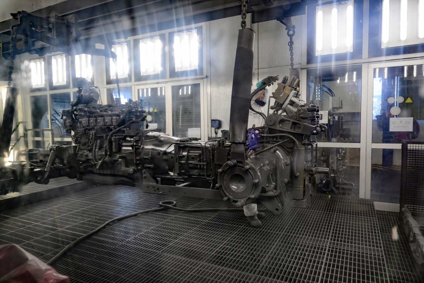 Les tuyaux de captage des fumées diesel sont eux aussi montés sur rails pour ne pas être arrachés des pots d’échappement lors de l’avancement des véhicules sur la chaîne. Les tests moteur peuvent ainsi être menés sans exposer les opérateurs, et évitent de faire ce qui se pratiquait autrefois : démarrer à côté d’une porte de l’atelier ouverte… qui ne l’était pas toujours par temps froid. Toujours au niveau des essais moteurs, d’autres dangers menaçaient les travailleurs évoluant à proximité : les mises en route sont réalisées avant la mise en place du capot des tracteurs, exposant les opérateurs aux risques liés à la rotation des courroies et au mouvement des autres pièces. Pour les protéger, des parois en polycarbonate supportées par un chariot sont maintenant positionnées à l’avant du tracteur et suivent sa progression.